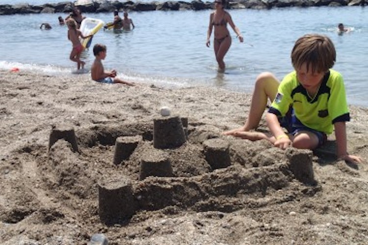 Røde, gule, grønne og blå parasolhoveder er stukket i den stenede strand. Børn i alle aldre myldrer omkring, mad hives frem fra kulørte strandtasker, smil deles og små venlige bemærkninger kastes mellem håndkæderne. I vandkanten fanges der fisk, hentes byggemateriale til smukke slotsbygninger eller spektakulære dæmningsværker i sand, og selvom sproget kunne være en hindring, så er nik, fagter og spand en effektiv måde at få nye venner på – i hvert fald som barn på stranden i Spanien.