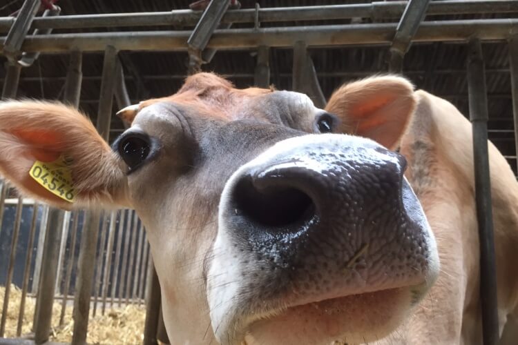 Svanholms 120 brune malkekøer og de cirka lige så mange ungdyr er nærmest smukke, som de står lysebrune og gumlende og ser på os med den ro, som kun kan finde sig til hvile i en ko-hjerne. De dybbrune øjne stirrer på os, mens hoveder virrer en smule. Pludselig kommer en blåviolet tunge til syne, længere og længere bevæger den sig ud af en ko-mund, og som en slange bugter den sig foran os, for få sekunder senere at sno sig om den uskrællede kartoffel, der ligger på jorden foran.