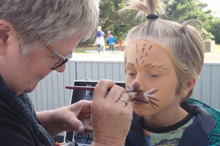 “Du har sådan en god hud at male på”. Penslen fører den løvefarvede maling rundt på Malthes kinder, mens kunstneren Ulla Andersen fortæller, hvordan hun lige kom forbi campingpladsen, og lige så godt kunne have mappen med ansigtsmaling med sig.