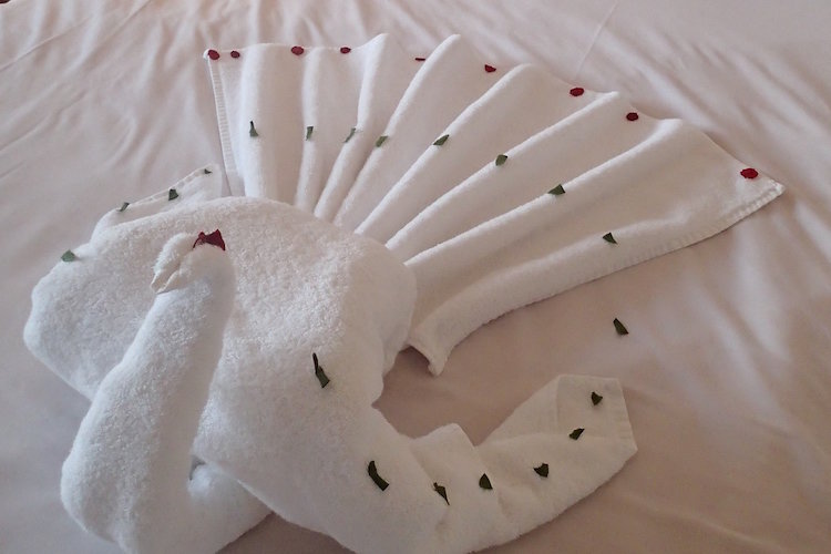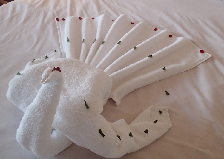 Håndklædeekvilibristisk har rengøringsmanden kræset for æstetikken på værelset. Fordi han kan, men også fordi vi hver anden dag har lagt en seddel fra USA på hovedpuden. På en uge bruger vi 10 dollars til et værelse med tre personer