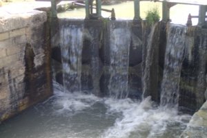 Forsigtigt sejler vi ind mellem de rustne jernporte, og efter at sluseporten er lukket drejer slusemesteren i et håndsving, og så åbner han sluselemmerne. Vandet fosser ind.