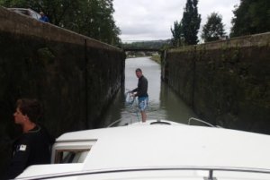 Vi er kaptajner på eget skib på de franske floder, og vi hygger os, men snart skal vores temperament og samarbejdsevner sættes på alvorlig prøve, når vi skal gennem de første sluser sammen.