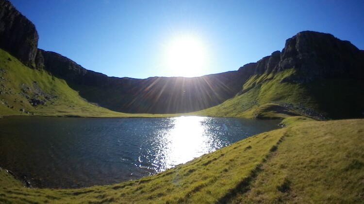Malthe og jeg vælger at begive os lukt ned af en stenet og mudret sti langs de sorte fjeldsider, hvor fugleskrig blander sig med de akrobatiske får, der går oppe, nede, på skrænter, på fjeldkanter og i dybe slugter. Fødderne skrider, benene vakler, det er om at holde fast i græstotter og stensider, men frem vil vi og efter omkring 20 minutters intens vandring når vi dalbunden, hvor solen spejler sig i den lille sø, Hvannavath. Øjnene fryder sig, maven bobler, vi har fundet essensen af at holde ferie sammen.