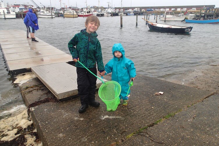 Det er sommer ved havnen i Agger, og Limfjorden skummer, men vi SKAL fange krabber, for det hører sig til. når vi er ved Vesterhavet – og i det hele taget ved snart sagt hvilket som helst hav. Det er også derfor, at de små grønne krabbefangere altid er i bilen.
