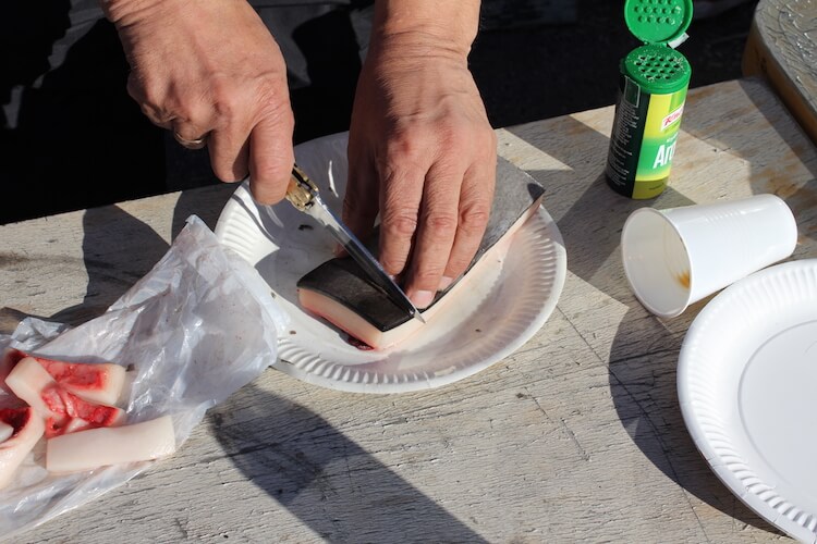 Glinsende marmorhvidt med et sort skind, lidt gummiagtigt, ikke dårligt, men fedt, meget fedt. Når bare det dyppes jævnligt i soya, så smager det ok. På kajakklubbens plads ved den store havn i den Sydgrønlandske hovedby Qaqortoq, er der linet op med paptallerkner fyldt med spæk fra marsvin eller delfin, som de lokale kalder det.