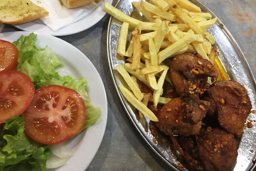 Vil I have stegt kylling – pollo frito – badet i en hemmelig marinade og påsmurt fingertykke hvidløgsfed, en helt simpel, men velsmagende omgang salat og pomfritter skåret til den store side eller saltede canariske kartofler?