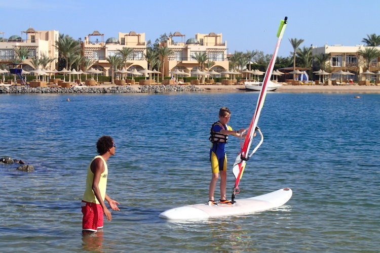 En ferie i Ægypten handler om at være sammen, om at slappe af, men også om at bruge tiden på noget man ikke plejer, og for 11-årige Malthe er det tid til at tage windsurfing-pas.