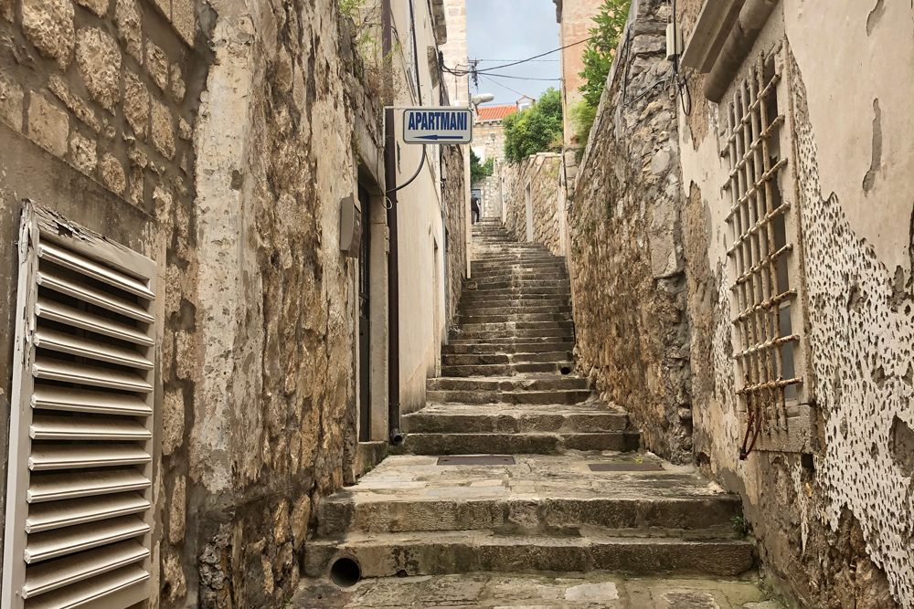 Et brunt skilt peger mod Pinakoteka, en af mange smalle, skæve og topcharmerende gader iført afskallede mursten og små hyggelige butikker. En enkelt cafe under en hvidmalet pil mod apartmani, hvor man for en billig penge kan fikse en overnatning.