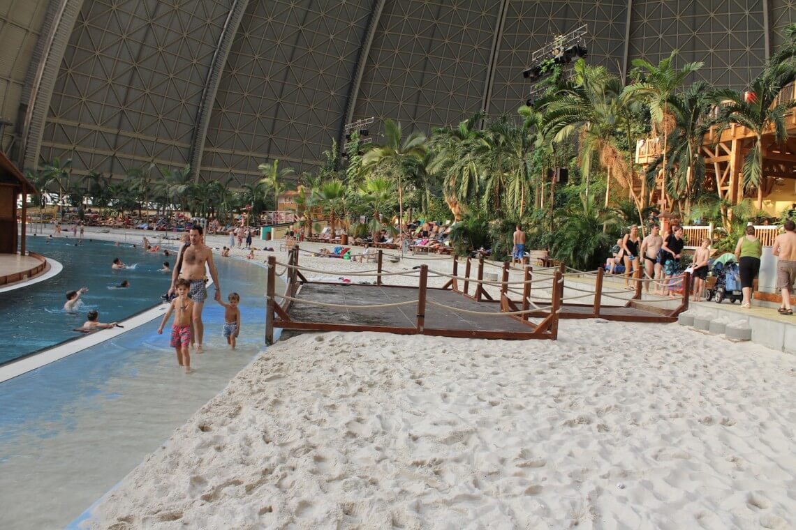 Vores vinterfrakker, lange forede bukser og solide skihuer er malplacerede. Det er den bedste beskrivelse af vores familie, som vi vandrer rundt blandt bikini- og badebukseklædte familier, der haster fra strand til restaurant for at indtage en sen frokost. Men når man går fra minusgrader til 27 plus på den tid, det tager at åbne en hoveddør, så er der et efterslæb hvad påklædning angår. Reklamerne lyver ikke. Tropical Island, en times kørsel syd for Berlin, er enormt, og særligt for børn er mulighederne mange, og så er der varmt.