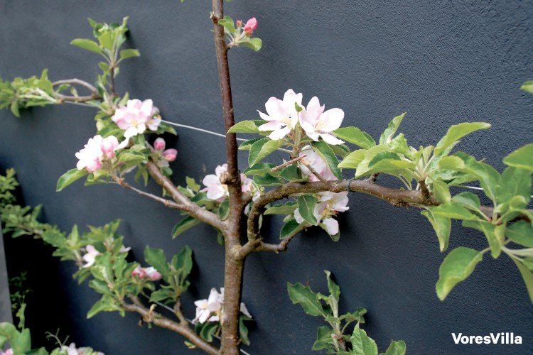 På lodrette vægge som plankeværk eller husmure er det nemt at dyrke hjemmeavlet frugt på espalier. Både pære- og æbletræer kan du beskære til en flad form, og de vandrette grene bliver bundet til væggen.