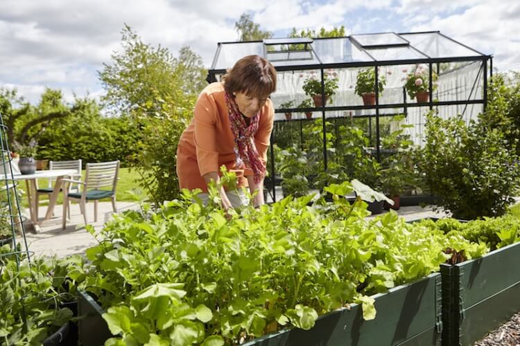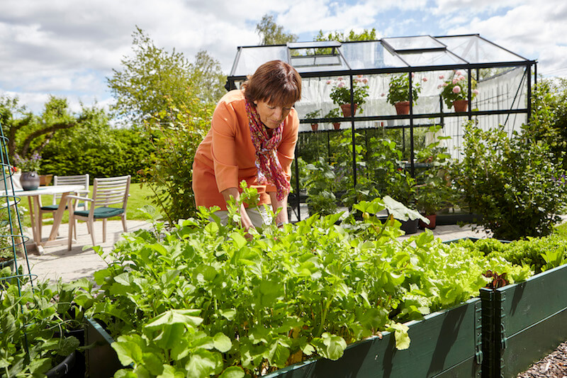 Det var ikke svært for Gunilla at vælge drivhus. Hun vidste, at det skulle være grønt, for det passede bedst til deres gule hus, og højbedene i køkkenhaven var allerede grønne. Hun ville også have et drivhus, der var let at vedligeholde, og som man kunne få meget tilbehør til. Valget faldt derfor på et Maxi 4 fra Euro Serre.