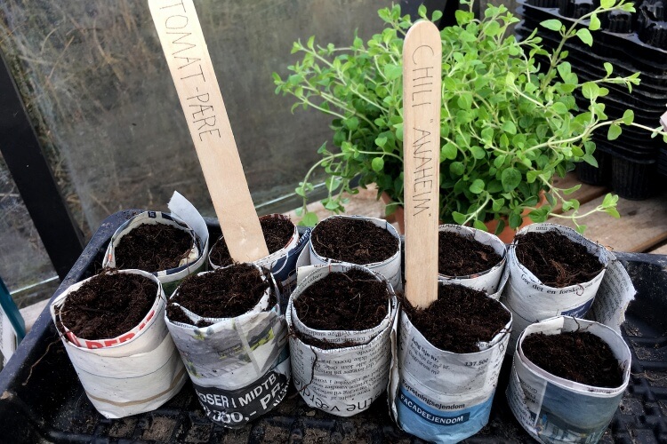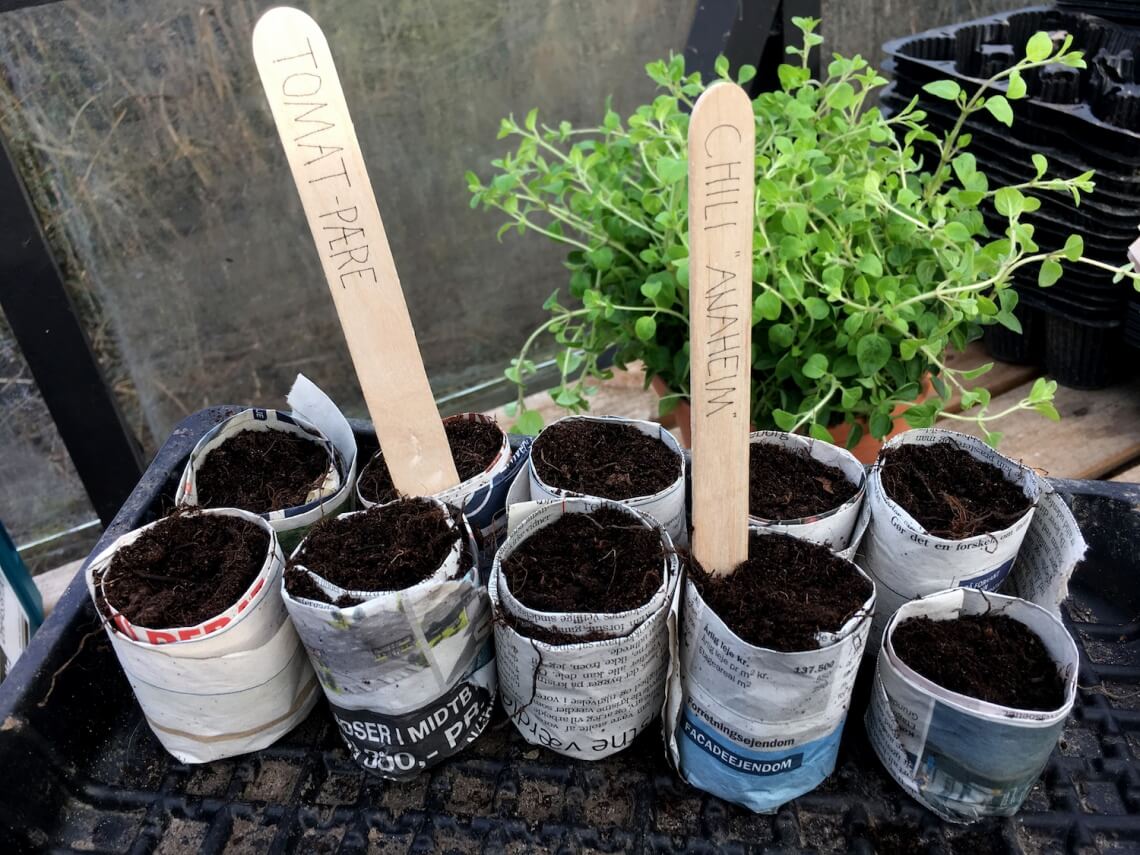 Vi benytter både plastik beholdere, avis rør og pap ruller alt efter hvad vi skal så. I videoen kan i se hvor nemt det er, at producere de små fine avisrør :-)