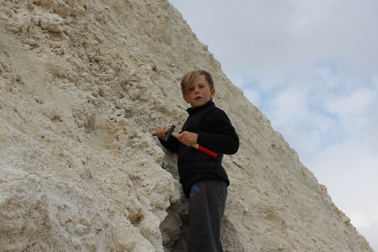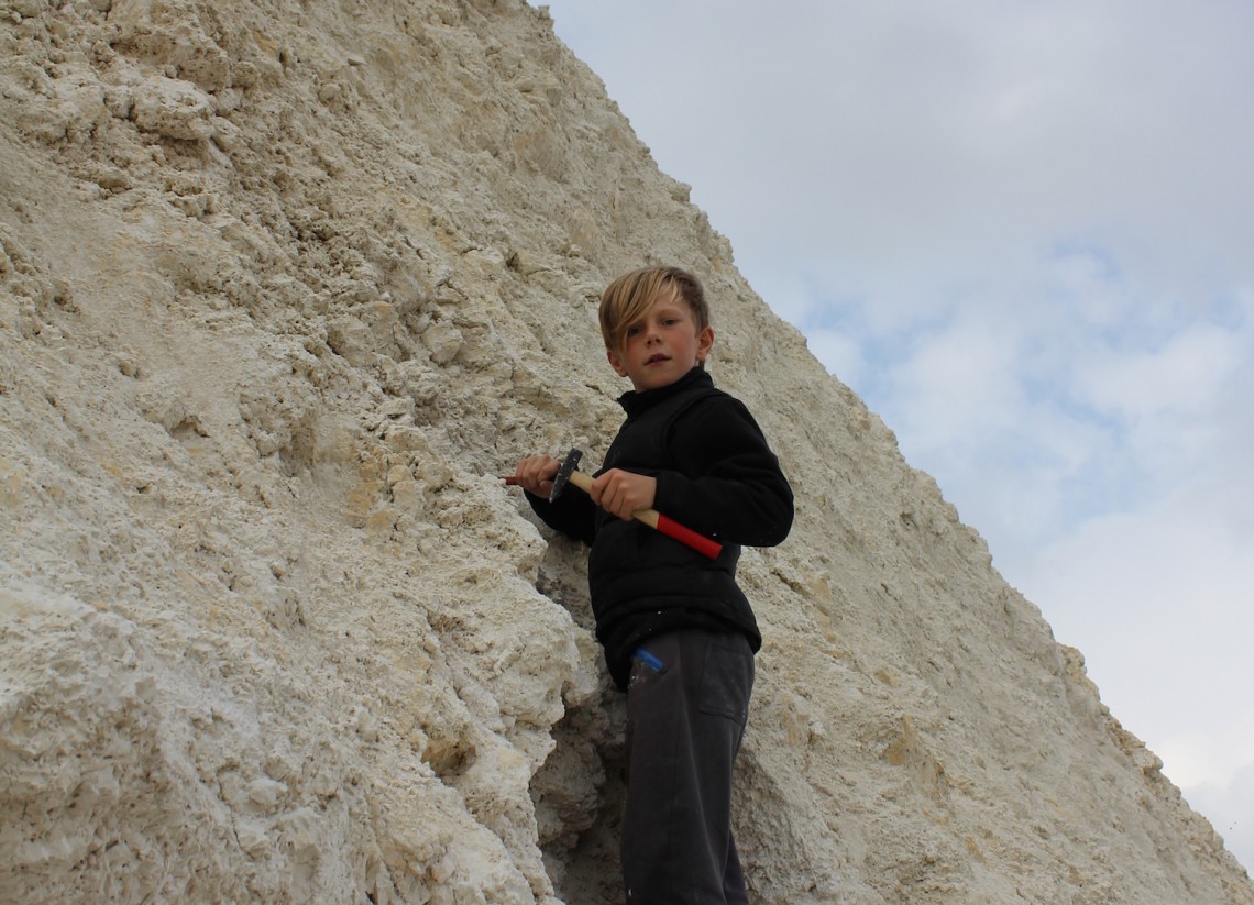 Hvidstøvede borer vores fingre sig ind i siderne på det over 40 meter dybe hul, som vi befinder os i. Omkring os er der kridhvidt så langt øjet rækker, og kun de andre lige så ivrige familier, der står bøjet over kalksten med numserne i vejret, bryder det sydeuropæiske udtryk.