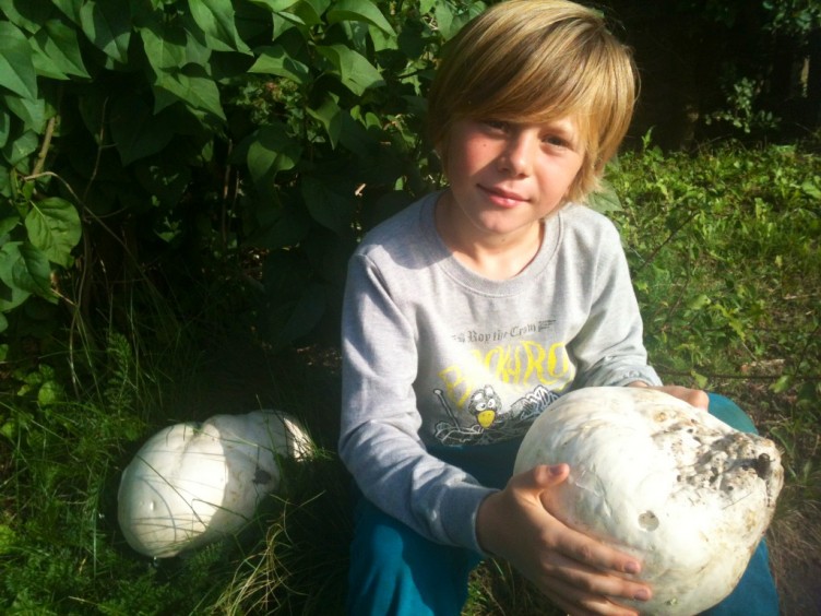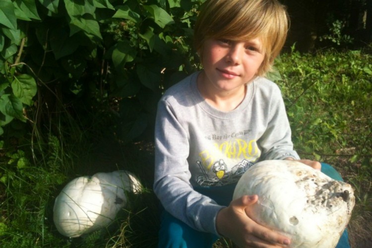 Malthe kigger stolt, mens han nikker med hovedet mod sine arme. Under dem har han to store fodboldlignende hvide ting, som han er fuldstændig overbevist om skal være vores aftensmad. Det er kæmpe-støvbolde, som pibler frem i naturen, særligt efter en solid omgang sommerregn, og som snildt kan spises, når den står på sensommertur i naturen.