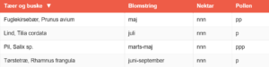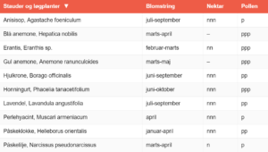 Når du vælger planter til den bivenlige have, skal du både vælge dem, der i kraft af deres nektar- og pollenmængde vil være guf for bierne, men du skal også sørge for, at der er blomstrende planter i hele perioden, hvor bierne er aktive. Pollen og nektar måles på en skala fra 1 til 3, hvor 3 er det højeste.