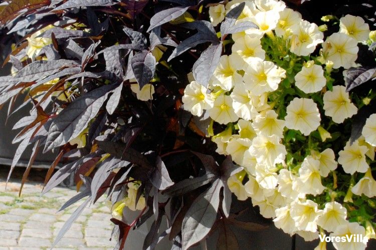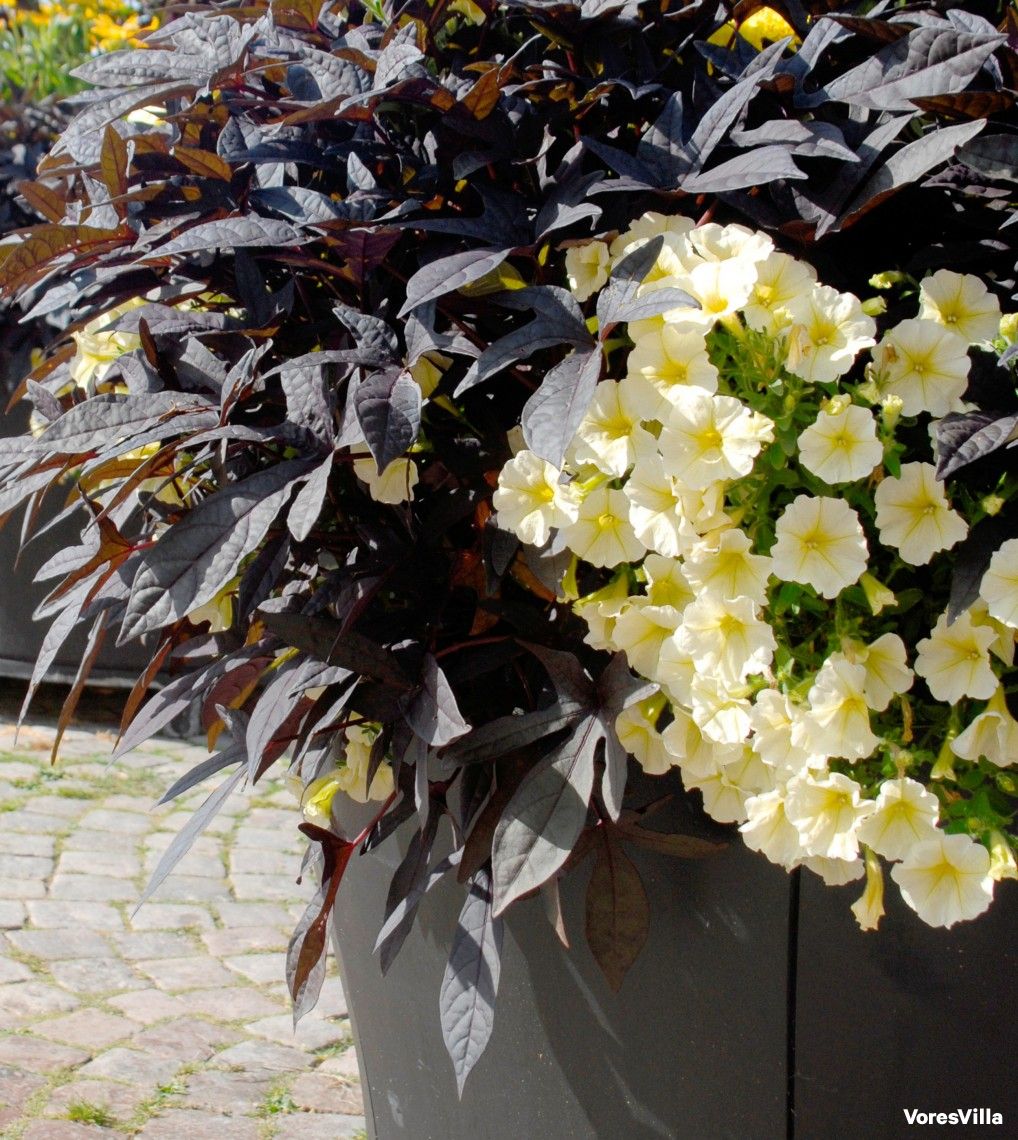 Prøv de to blommefarvede sorter af Ipomea – de hedder ‘Sweethaert Purple’ og ‘Midnight Lace’. De er iøjnefaldende og nemme at matche med andre planter, der blomstrer. Kontrasten mellem det blommefarvede løv og de gulgrønne-limegule- gullighvide farver er meget smuk.