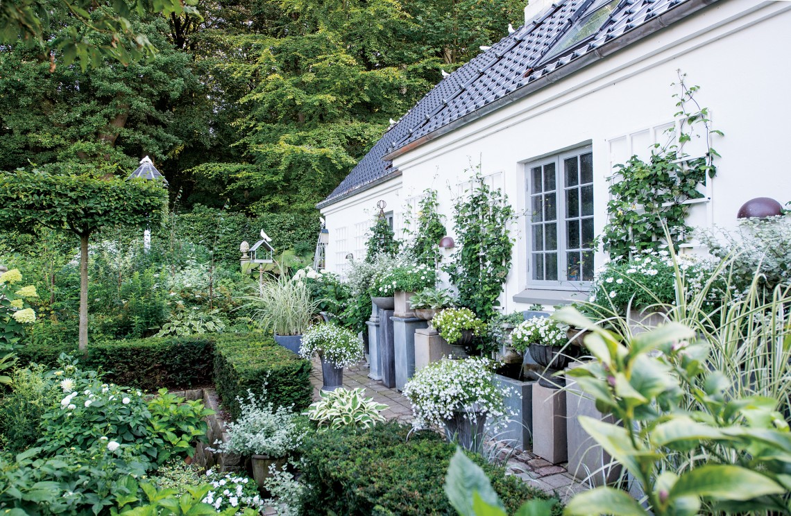 Fordelen ved at plante i krukker er, at man hele tiden kan bytte ud og flytte rundt. Og selv på den mindste plet kan man skabe frodighed. Også her hylder jeg gentagelsesprincippet, og jeg har gennem årene gjort det til en helt særlig disciplin at plante i krukker. Krukkerne står helt tæt sammen og danner næsten små bede.