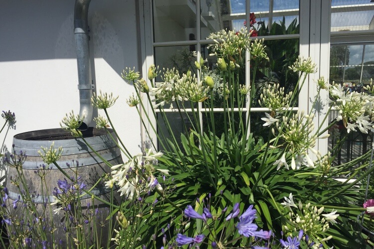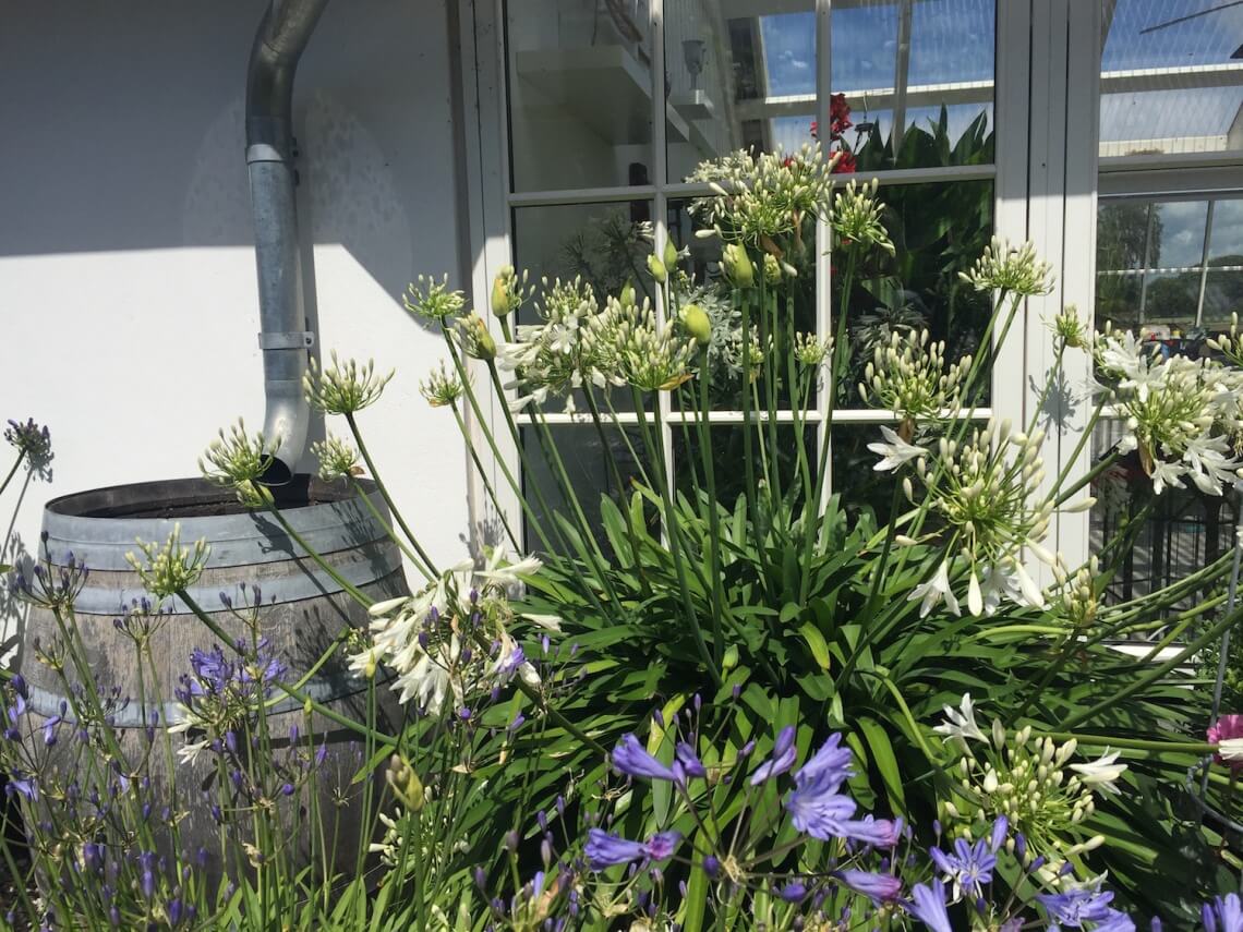 På billedet ser du Agapanthus eller skærmlilje, der blomstrer netop nu. Eminent til store krukker. Skal opbevares frostfrit. Fås også med hvide blomster.