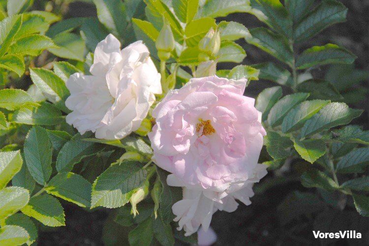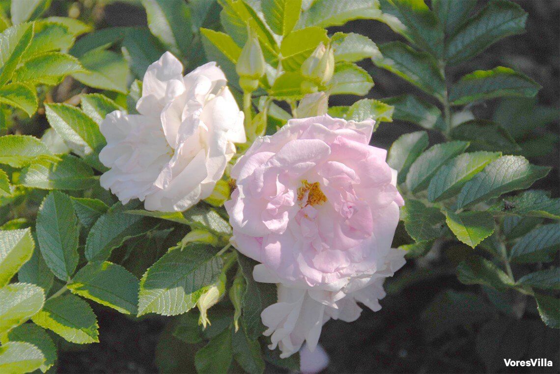 3. Louise Bugnet Hvide, fyldte roser med en pink kant på de nye kronblade. Stærkt, sundt løv. Bliver 1-1,50 meter høj.