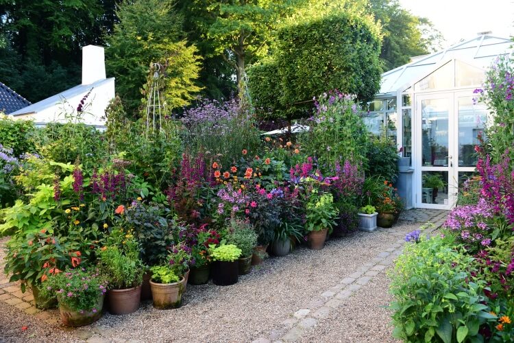 I foråret er det løgvæksterne, der er i højsædet sammen med stedmoder, hornviol og bellis. Når de takker af, er det tid for sommerblomsterne. Stauder, buske og små træer planter jeg også i krukker for at skabe højde. Niveau-forskelle er vigtige for at undgå, at det hele bliver for fladt. Derfor gør jeg også brug af slyngplanter, der vokser op ad høje jernstativer placeret i store træbødkerkar.