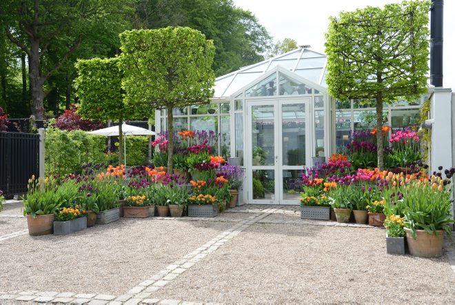 I dette forår var der tryk på kedlerne rent farvemæssigt. Foran drivhuset havde jeg nemlig tulipaner i orange, purpur, lavendel og pink toner. Disse farver går ofte under betegnelsen Kenzo colours efter den japanske modeskaber Kenzo Takada, der har gjort det til sit særkende at arbejde med farvekonstellationer i denne stil.
