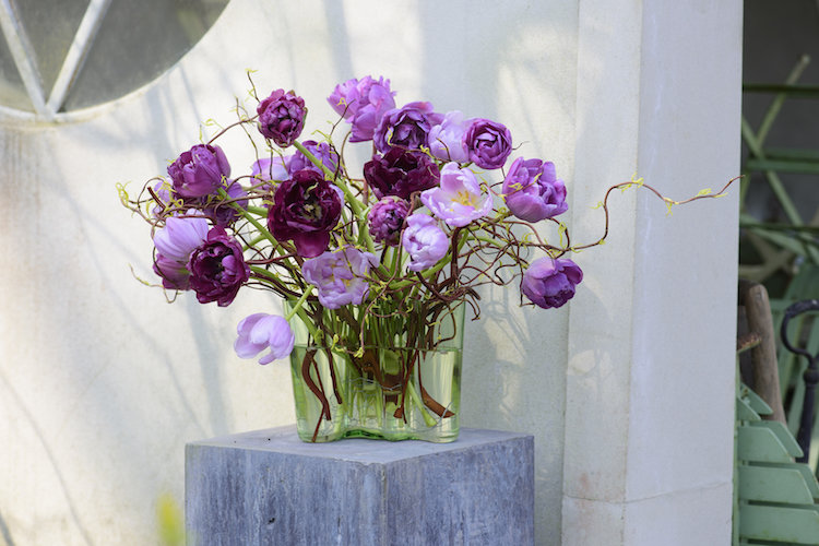Tulipaner fra blomsterhandleren er arrangeret mellem troldpilgrenene, der holder tulipanstænglerne på plads.
