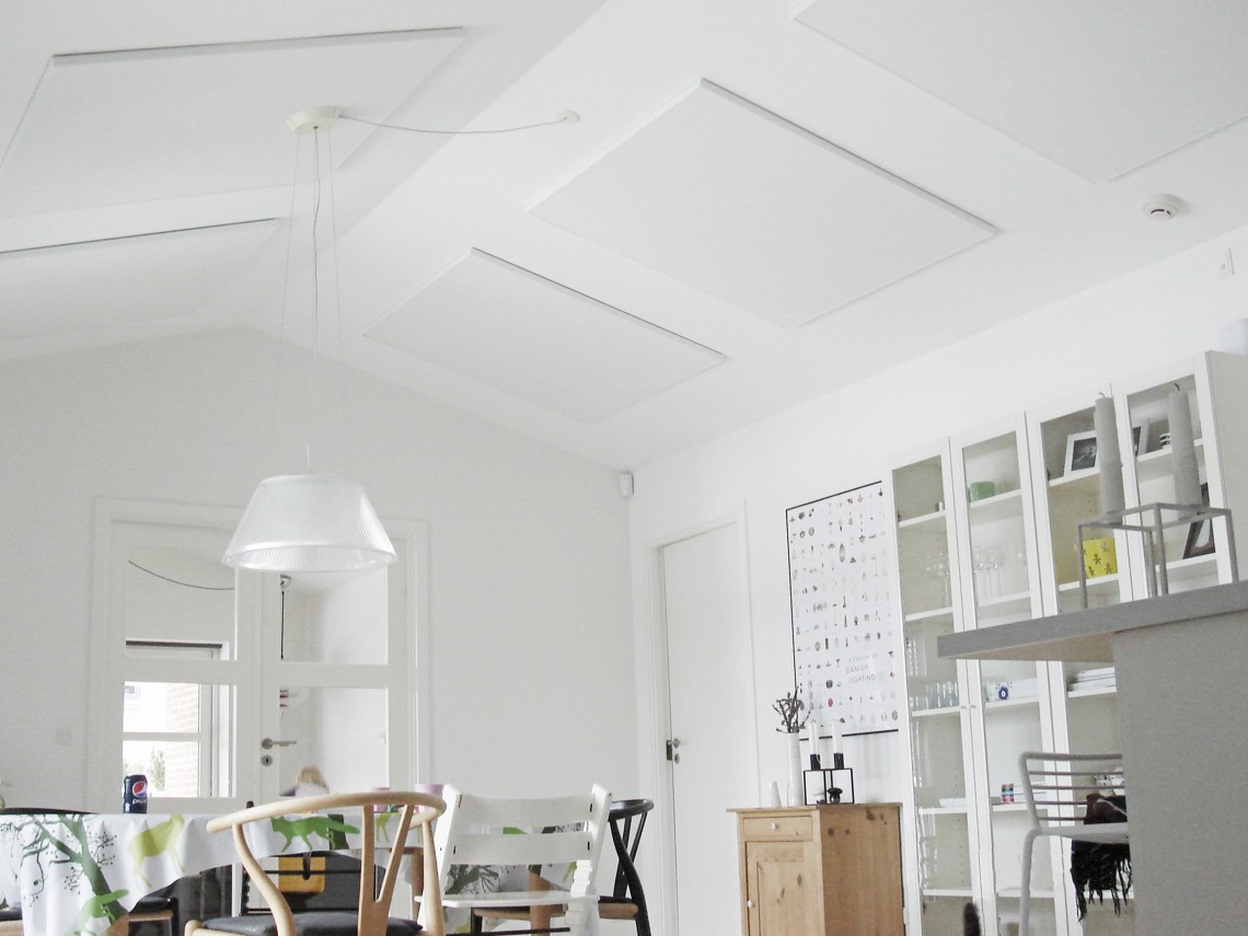 Men hvis du allerede har et hus og døjer med dårlig akustik, er der flere muligheder for hjælp. Der kan f.eks. sættes lydabsorberende plader op på loftet, som afhjælper støjen.