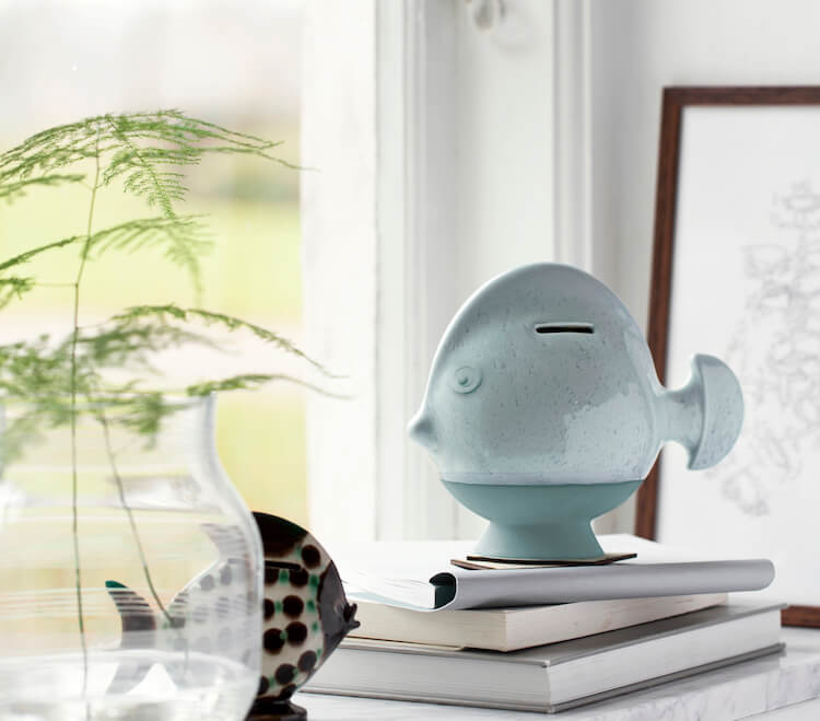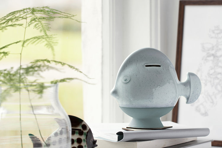 Denne sæsons nye sparedyr er unikt, dansk design, der er udformet som fabelfisk og fås i tre forskellige silhuetter med seks forskellige, farvede glasurer. Alle har omhyggeligt hånddekorerede øjne og et hul til møntindkast øverst på ryggen, mens pengene kan komme ud igen via et hul i bunden, der lukkes med en korkprop.