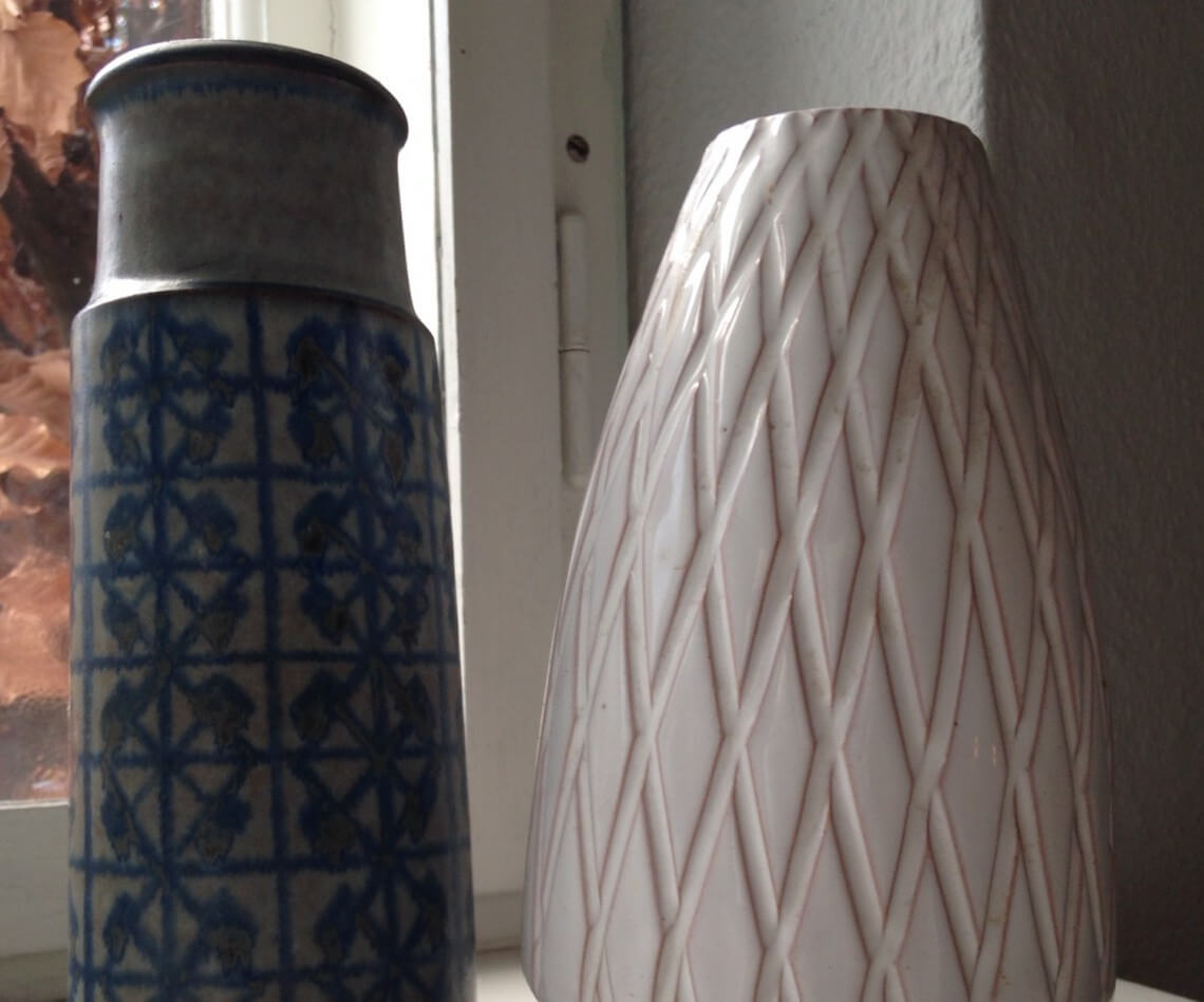 I en anden af kasserne fandt jeg et par gamle vaser, krukker, potter, et par pyntefigurer fra Royal Copenhagen og et askebæger af brunglaseret stentøj. Hele molevitten er vel fra en gang i halvfjerdserne, fra da jeg selv var barn. Fra dengang min mor gik til lerdrejning på aftensskole og udsmykkede vores hjem med alt, hvad den kunne trække af hjemmedrejet ler; fra svulstige lamper dekoreret med mønstre, kugler og pudsige indfald til skåle, vaser og krukker glaseret i orange og koboltblå nuancer.
