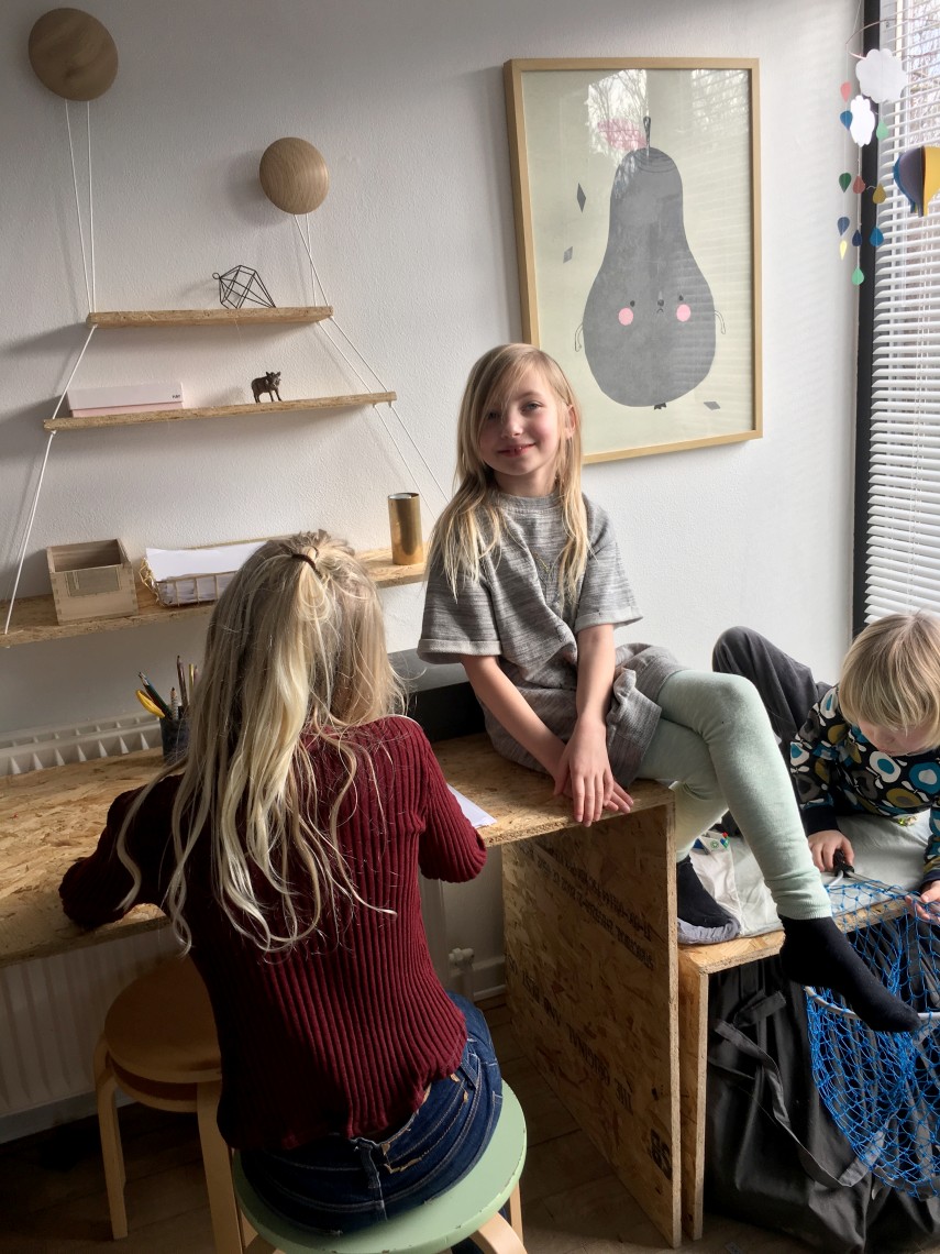Da gangen er meget smal, skulle væggen også udnyttes bedst muligt. Her i familien tegner og maler vi en del, så med 4 børn skulle hjørnet både bruges til legehjørne for de mindste, og tegne/lektielæsning til de store.