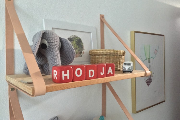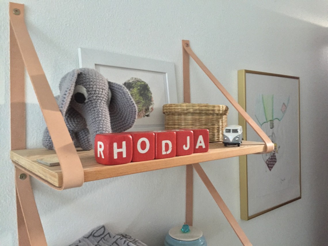 Noget af det vi kom til at mangle var hyldeplads, Helene havde en ide om en hylde, der var lavet af genbrugs-træ og læder stropper. Hun bestilte læder stropperne på nettet, og sammen fandt vi et gammelt skab på loppemarkedet. Fra skabet tog vi en hylde, som vi delte over i to. Så vi havde to gode hylder.