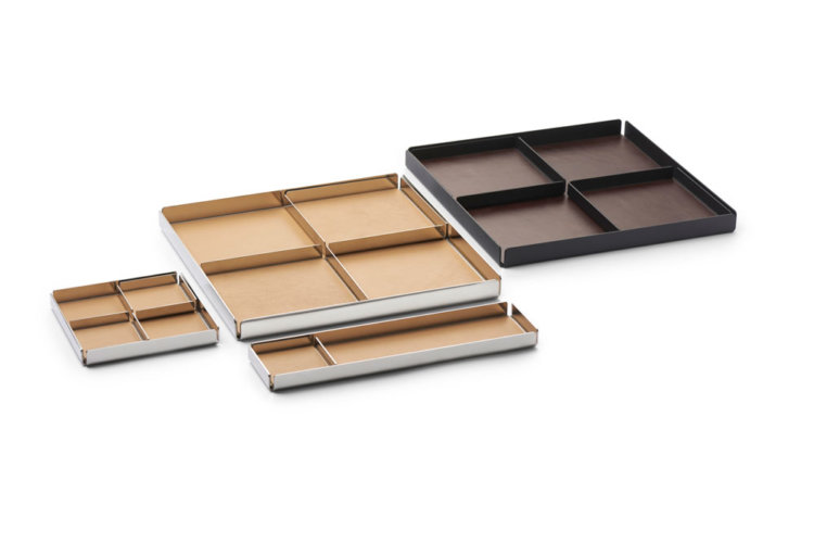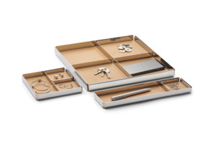 Den mere markante model, Pockets’ Rest Organiser Tray Set, fås i sølvblank rustfrit stål med lys læder eller sort pulverlakeret stål med mørk læder.