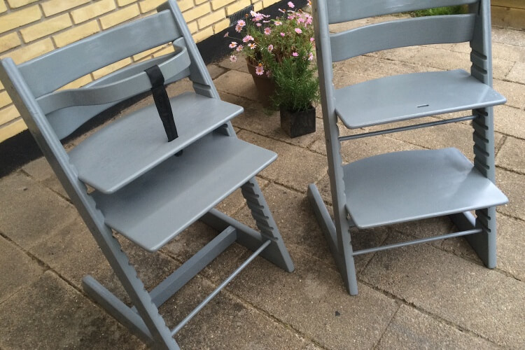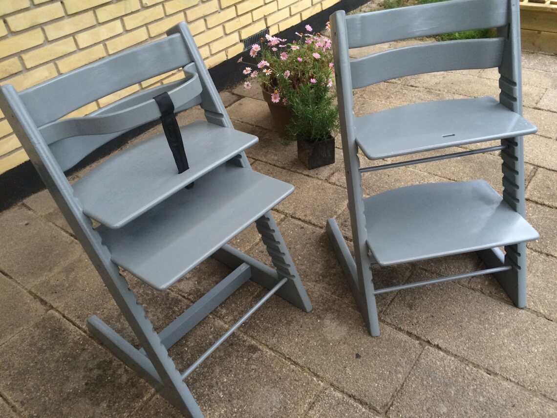 Vi har forøget familien og efter vores trip trap barnestol har været brugt til 3 børn, er de efterhånden godt brugte. Vi syntes de trængte til at blive shinet op, nu hvor Hodja skulle bruge dem. Vi valgte at male dem lysgrå fordi vi gerne ville have, at de fremstod lidt lettere, istedet for sorte som de var.