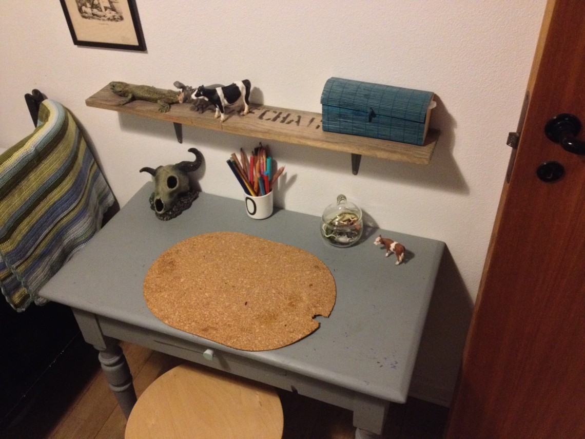 Dernæst har jeg spraymalet de to hvide hyldeknægte lysegrå, så de passer til bordets farve. Når malingen er tør, er det bare om at få sat hylden op.