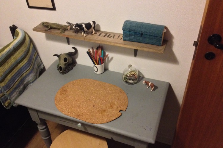 Jeg har lige lavet denne hylde til min søn Orlas værelse, da han har fået brug for lidt hyldeplads. Den er super nem at lave. Jeg har brugt to hyldeknægte på 75 x 100 mm og et gammelt stykke træ fra en fragtkasse, jeg havde stående og alligevel ikke skulle bruge til noget.
