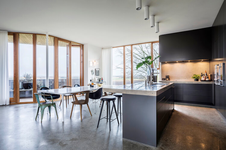 I dette hus har arkitekt Rasmus Bak arbejdet bevidst med sammensætningen af hårde og bløde materialer, hvor bl.a. de rå betongulve får modspil af det varme og gyldne egetræ i køkkenet. Kogenichen er ”foret” med en smuk natursten, der er praktisk og rengøringsvenligt, men samtidig giver køkkendesignet et eksklusivt udtryk.