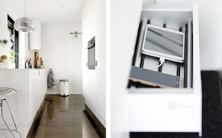 Tablets har erstattet de traditionelle kogebøger, når vi skal finde opskriften til aftensmaden og planlægge dagens indkøb. De fleste af os kender derfor til virvaret af ledninger og opladere på køkkenbordet, når tablets og telefoner skal have strøm. Med en opladerskuffe fra JKE Design kan du gemme telefoner og anden teknik væk i en køkkenskuffe, mens det oplades og få mere plads på køkkenbordet.