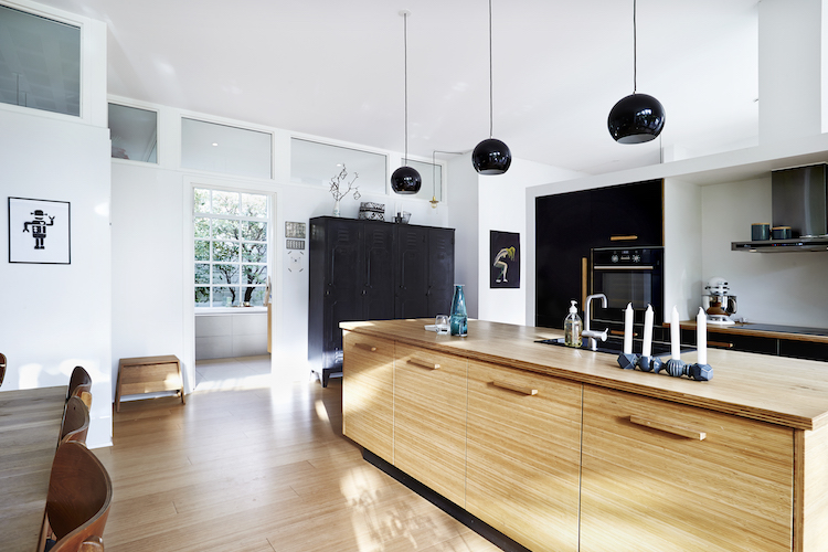 Materialer indvendigt: Bambusgulv, køkken- og badeværelsesskabe i bambus fra Køkkenskaberne, garderobeskabe fra Kvik.