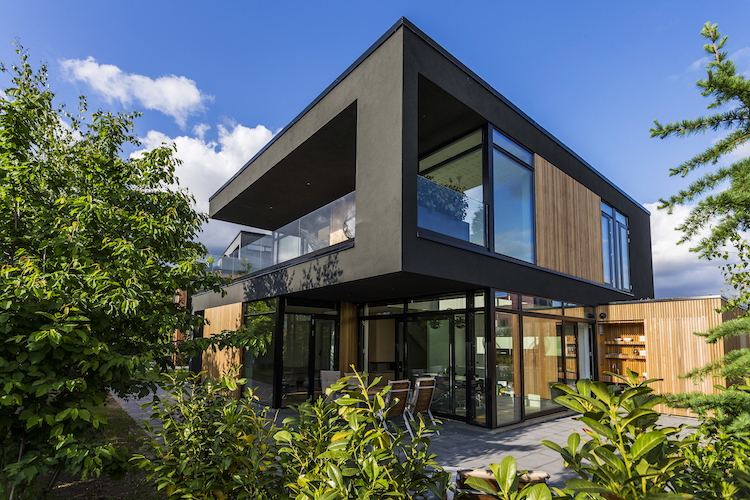 Materialevalg udvendigt: En let konstruktion med beklædning af olieret cedertræ og felter af antracitsort puds.