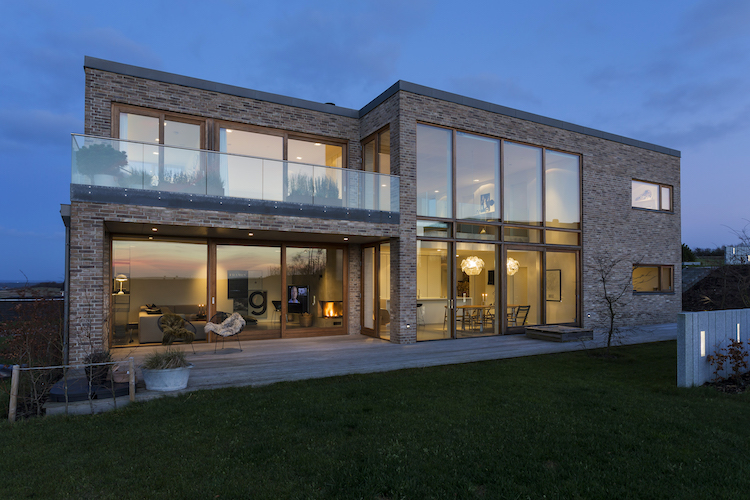 Materialevalg udvendigt: Facade muret op i håndstrøgne tegl fra Petersen Tegl. Vindues- og dørrammer samt garageporte i egetræ.