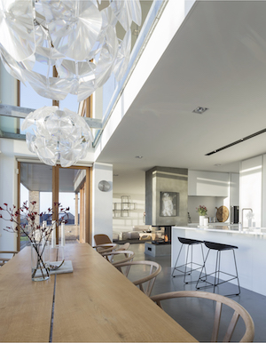 Parret sværger på indretningssiden til kontraster. De rene, arkitektoniske linjer, stueetagens rå betongulve og minimalistiske køkken er blødt op med møbler og vinduesrammer i egetræ, ligesom især førstesalen og facaden byder på skifer og andre natursten med bløde konturer og changerende nuancer.
