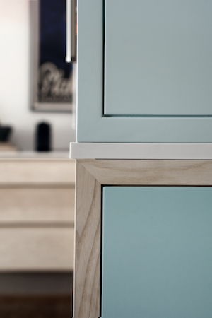 Ejeren har selv valgt farverne i blå og grønne nuancer af turkis til skabslågerne, der er lakeret af en autolakerer og måtte ligge og afdampe i flere måneder på et autoværksted. Grebene er fra det tyske beslagfirma Hettich og går igen i køkkenet for at fuldende et industrielt look.