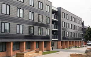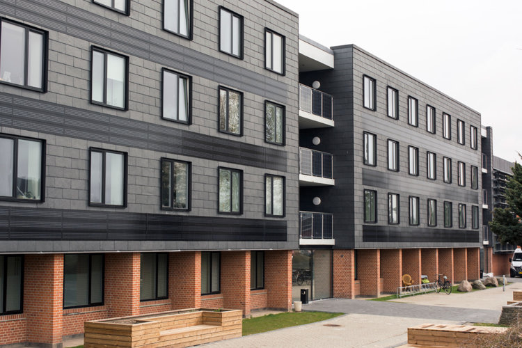 Billede 1: Kant arkitekter står bag denne ombygning til ungdomsboliger, hvor der er solceller i facaden og i glasværnet på altanerne. Foto: Kant arkitekter.