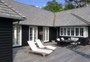 Giv dit traditionelle sorte træsommerhus et eksklusivt, men stadig klassisk udseende med træspån på taget – som arkitekt Riko Sprohar Lundqvist ovenfor har gjort.