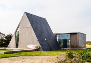 Taget, der ligesom resten af huset er både tegnet og ejet af arkitekt Søren Sarup, er belagt med naturskifer, der med sin naturlighed og råhed passer godt til facadens ubehandlede og rå trælameller samt beliggenheden tæt ved det brusende Vesterhav.