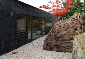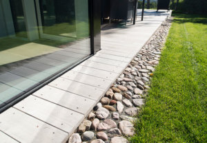 Er der en højdeforskel imellem gulvniveauet i stuen og græsset i haven, er det oplagt at udnytte den til at lave spændende materialeovergange mellem terrassen og haven. Her er der lavet en praktisk ‘drypbakke’ af strandsten langs tagudhænget, der samtidig fungerer som en smuk indramning af træterrassen.