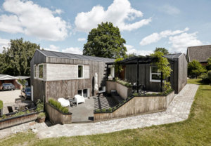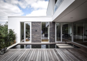 Skab harmoni mellem lodrette og vandrette flader ved at vælge materialer, der harmonerer. Her har arkitekten kombineret terrassens sølvgrå cedertræ med hårdbrændte facadetegl, der ligger inden for den samme gråtoneskala.