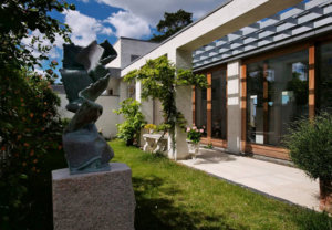 Moderne huse med store glaspartier, hvor det smukke vandspejl også kan nydes indefra og samtidig give spændende lysrefleksioner i loftet.