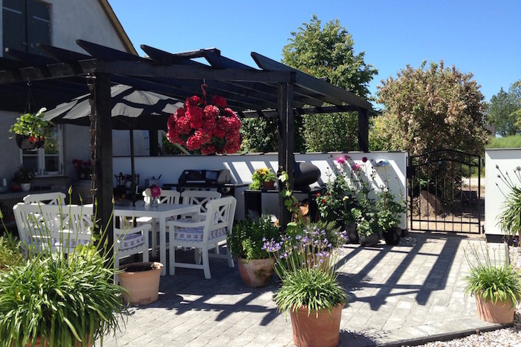 “På den store terrasse skal du tænke rum i rum for at fylde den ud og gøre den hyggelig. Overvej at lave højbede med hjul og espalier, hvor du kan dyrke klatreplanter op ad, så du får flytbare, grønne vægge. Du kan også skabe samme effekt med masser af høje, store krukker, for eksempel med krydderurter, du kan plukke til maden. Har du en overdækket terrasse eller et bredt tagudhæng kan du fastgøre planteophæng, så planterne kan hænge ned fra loftet – det er med til at skabe intime rum.”