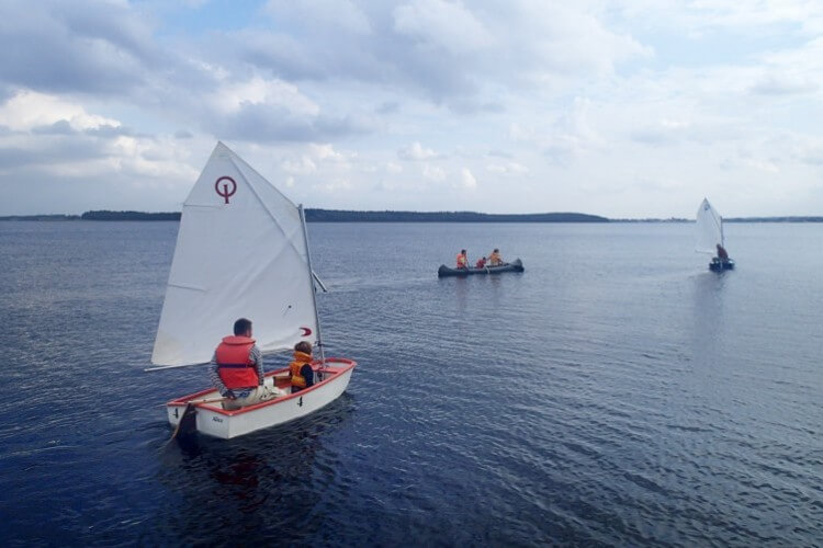 Først sidder jeg smilende og nikker, mens kommandoerne råbes fra land. Helt ærligt, over 150.000 børn i 100 lande kan finde ud af den lille jolle, så det kan jeg da også, og Malthe sidder fortrøstningsfuldt i stævnen og er overbevist om, at vi om et øjeblik vil give de mange andre optimister en ordentlig lærestreg, når vi stryger forbi dem.